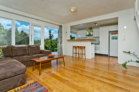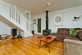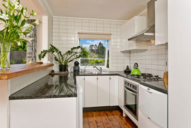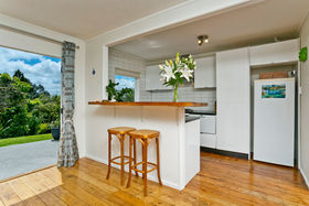 Contemporary kitchen and polished timber floors and log burner that warms the home.