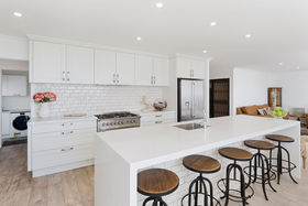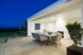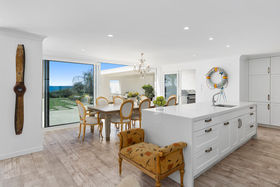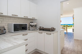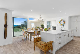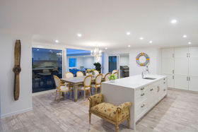 The kitchen with large scullery opens to the expansive living rooms and onto the beach front lawn. Here the children can play, and the outdoor entertaining area is perfect for the BBQ gathering.